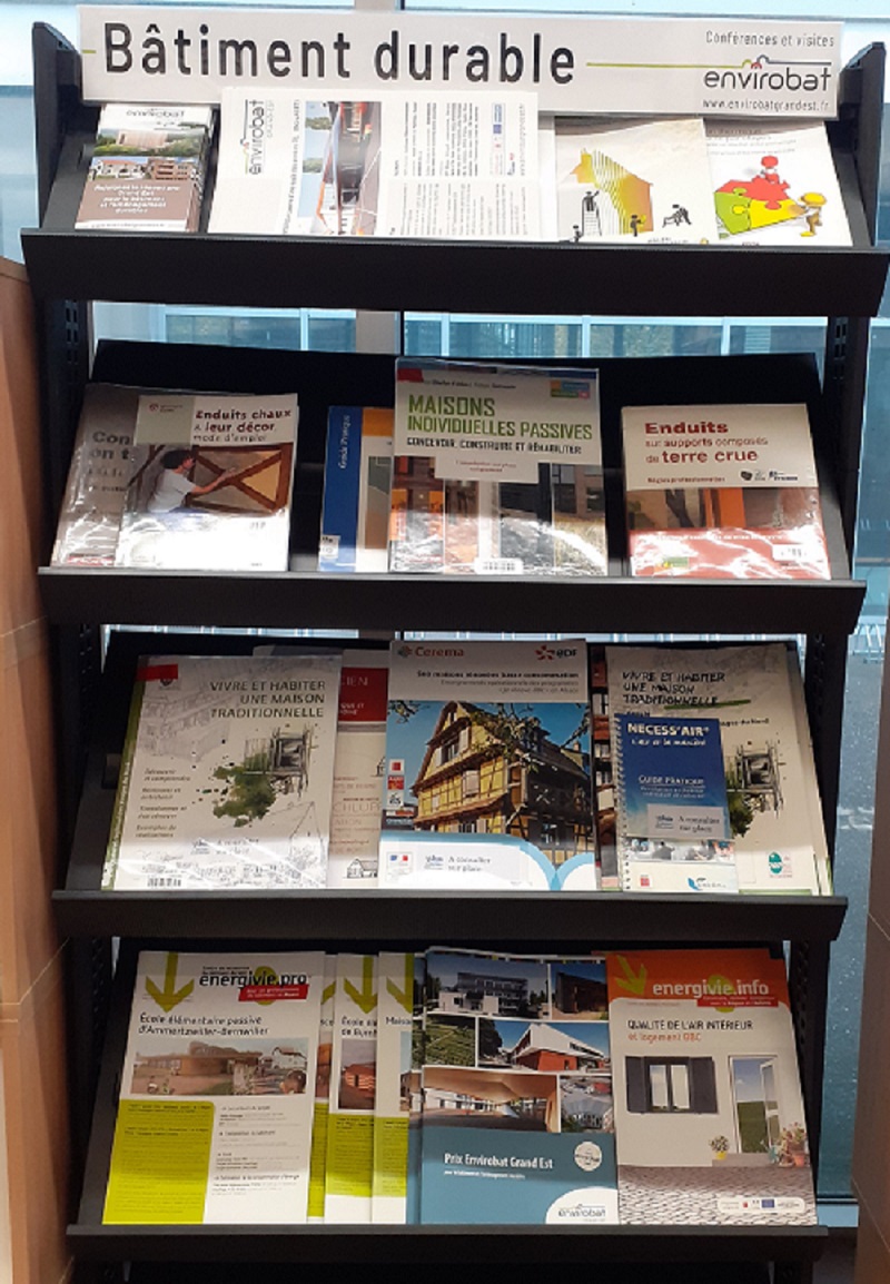 Ces ouvrages sont exposés en salle sur un présentoir dédié (à consulter sur place ou à emprunter), ainsi que de la documentation spécialisée est mise à votre disposition par Envirobat.