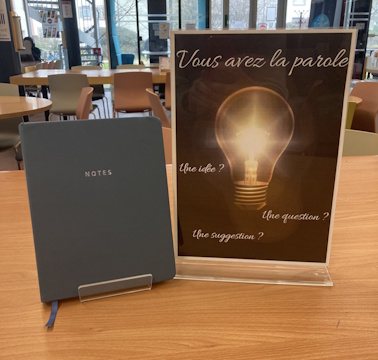 Sur les tables de travail, le cahier de suggestion vous permet de vous exprimer librement
