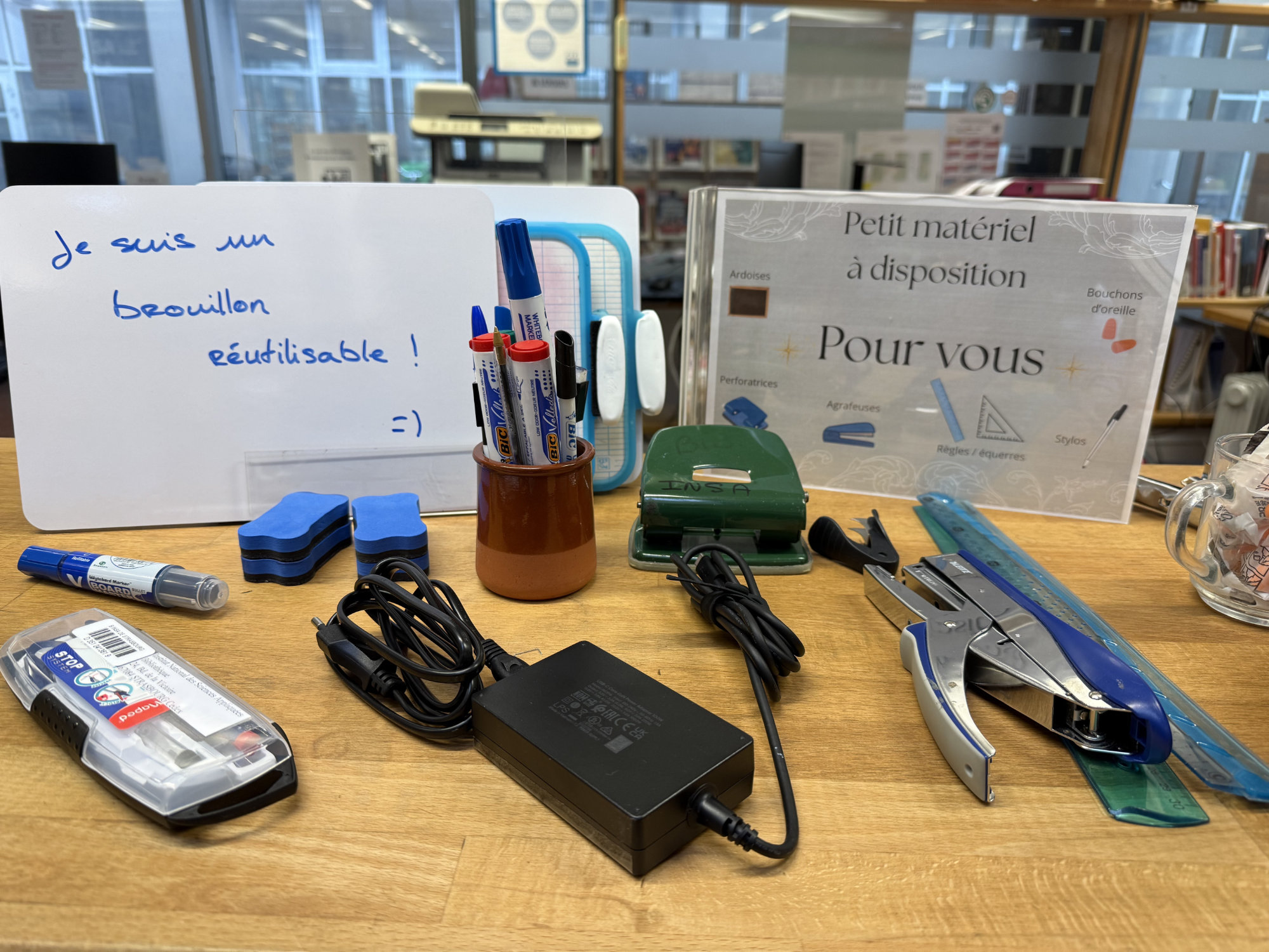 En plus des calculatrices et chargeurs de téléphones, un chargeur PC en USB-C et un compas sont désormais disponibles à l'emprunt. Il vous suffit de les demander à l'accueil de la bibliothèque.